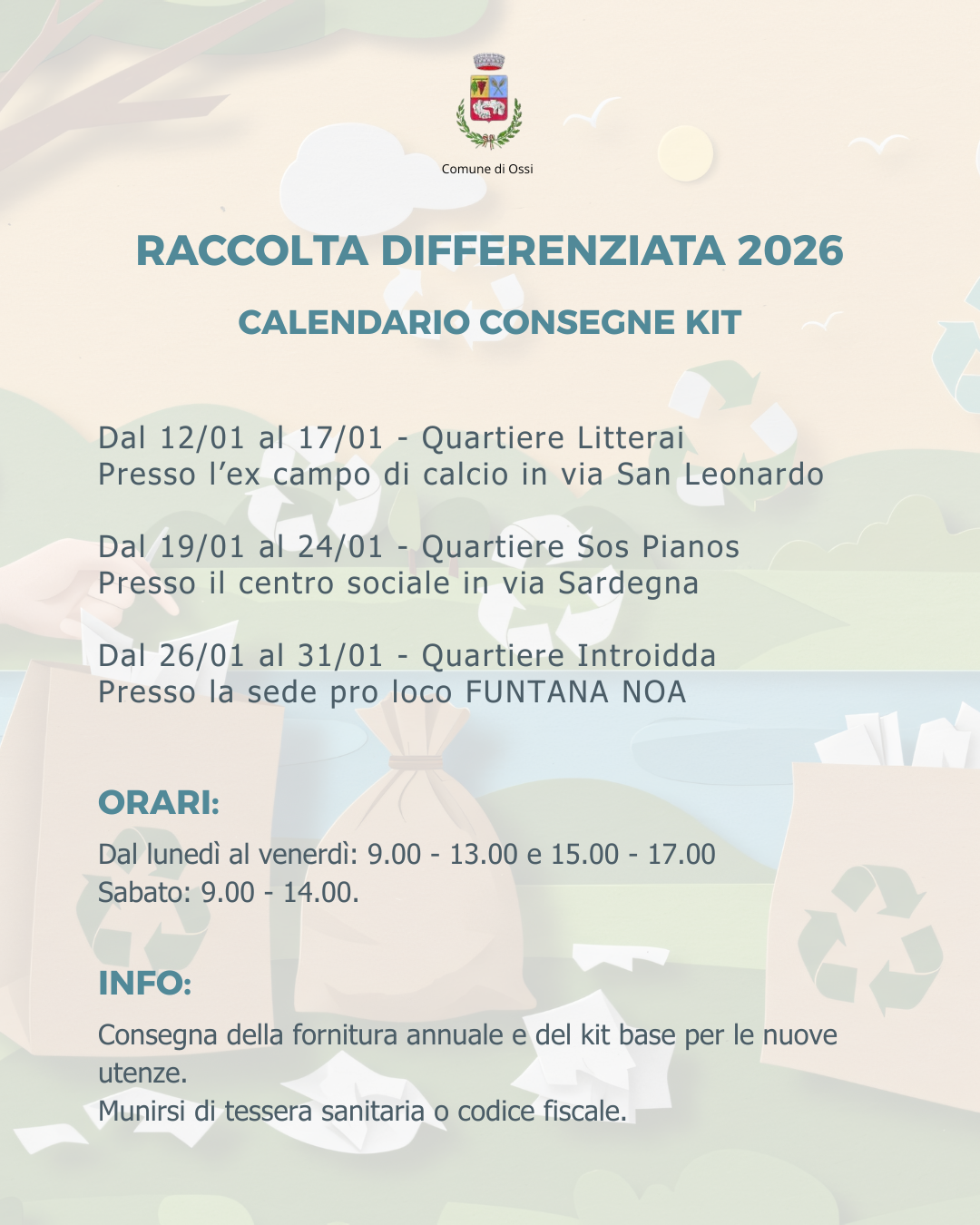 Si informano i cittadini che, nel mese di gennaio, sarà avviata la consegna dei materiali per la raccolta differenziata per l'anno 2026. Verranno distribuite le buste riservate alle utenze già a ruolo e il kit completo per le nuove utenze, comprensivo di buste e mastelli.