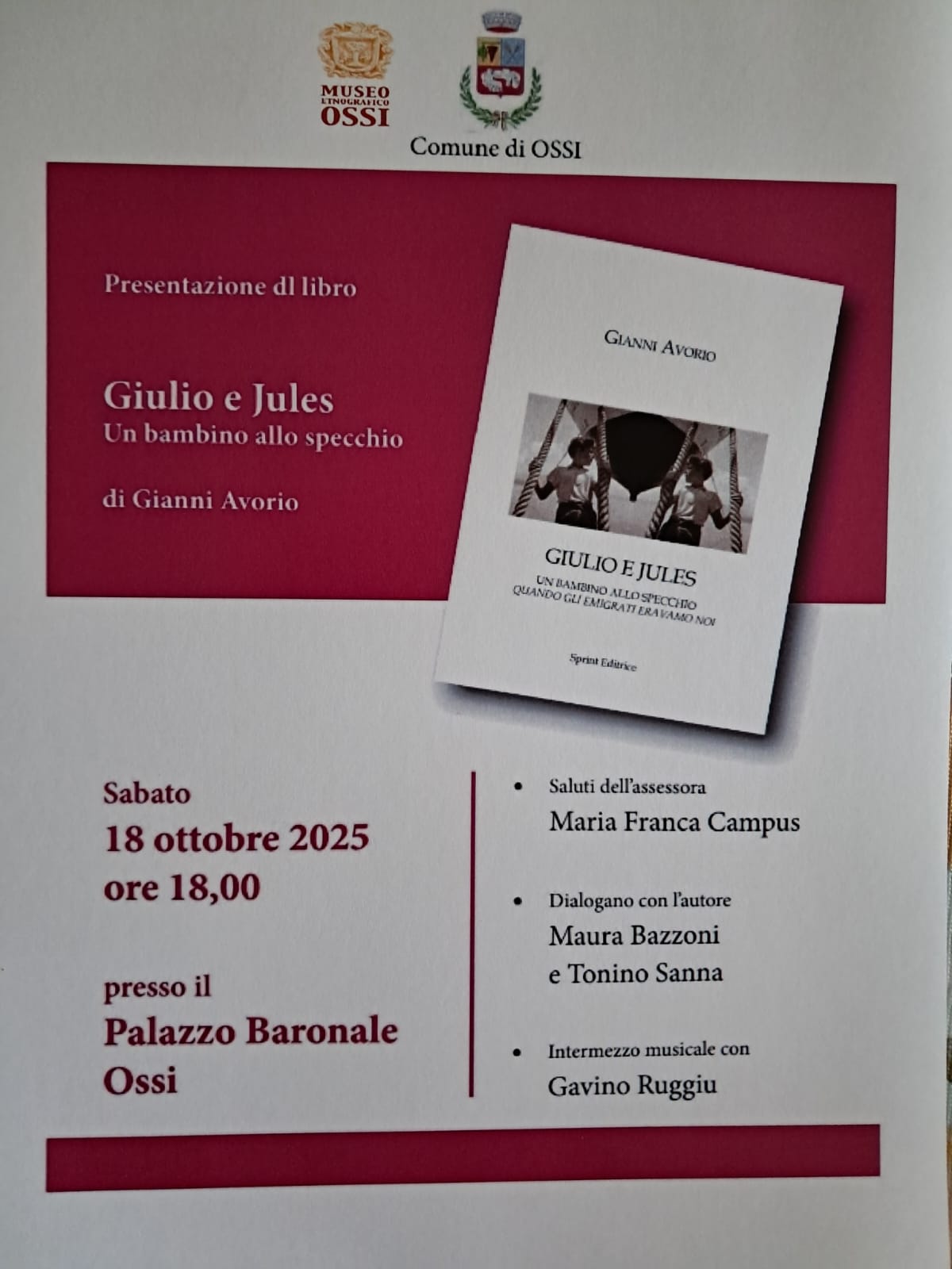 L’Assessorato alla Cultura del Comune di Ossi invita la cittadinanza alla presentazione del libro “Giulio e Jules. Un bambino allo specchio. Quando gli emigranti eravamo noi” dell’autore Gianni Avorio, in programma sabato 18 ottobre 2025 alle ore 18:00, presso il Palazzo Baronale di Ossi.
