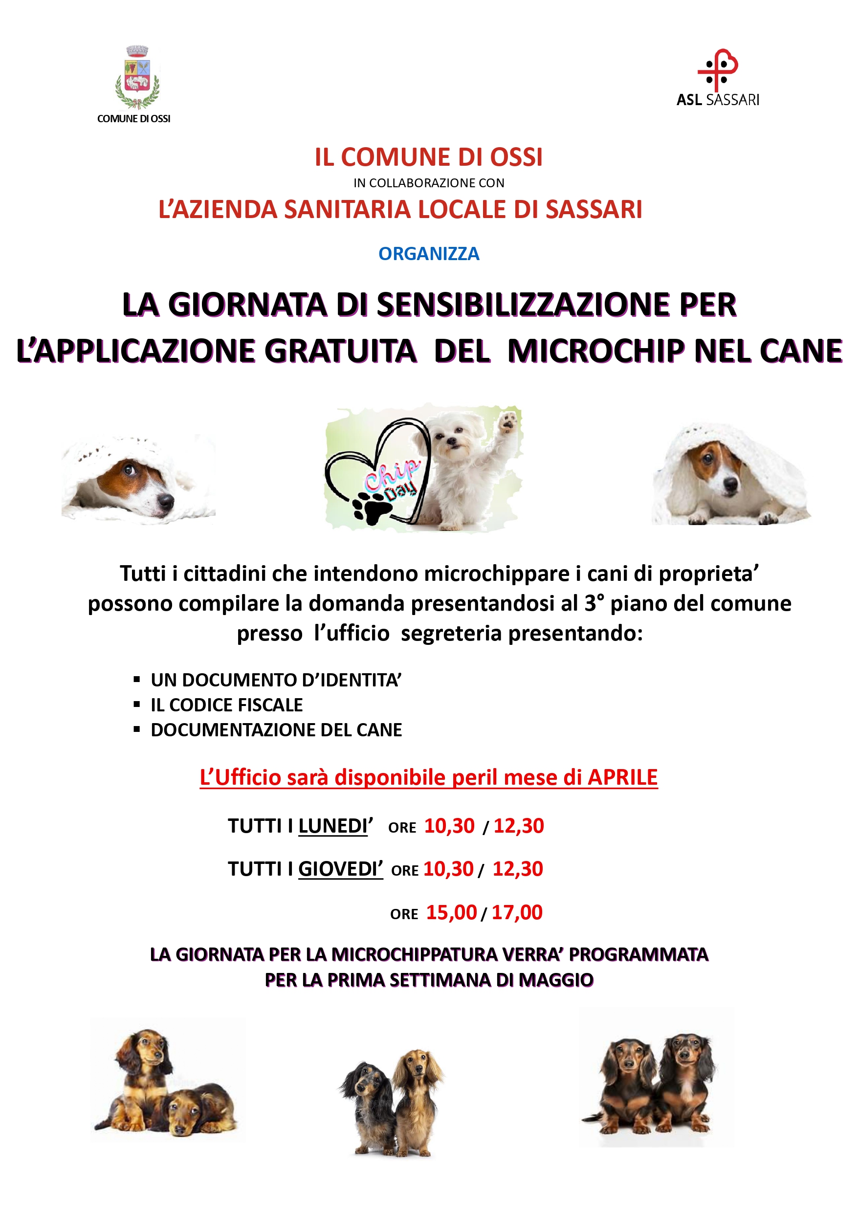 Il Comune di Ossi, in collaborazione con l’Azienda Sanitaria Locale di Sassari, promuove una giornata di sensibilizzazione per l’applicazione gratuita del microchip ai cani di proprietà.